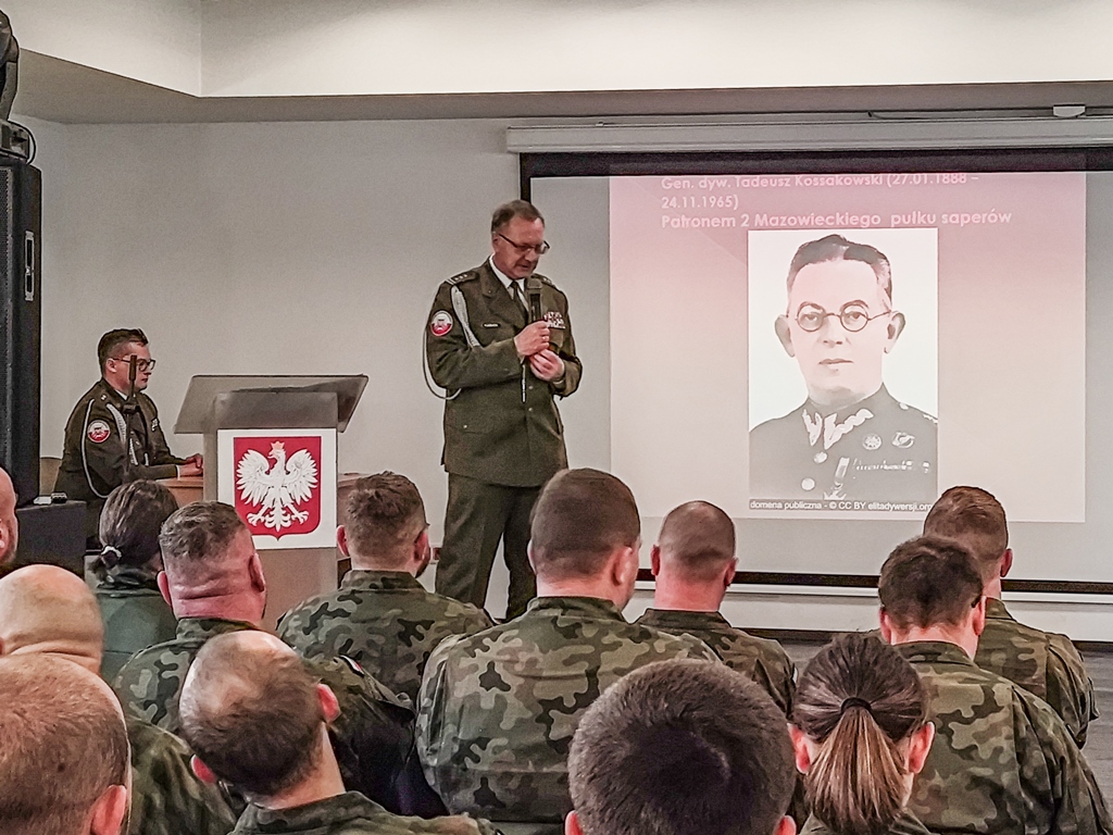 Płk rez. Alfred Kabata przypomniał, że decyzją Ministra Obrony z 5 listopada 2019 r. gen. dyw. Tadeusz Kossakowski (1888 - 1965) ps. „Krystynek” został patronem 2 Mazowieckiego pułku saperów. Następnie zapoznał słuchaczy z działalnością wojskową trwającą od 1914 do 1945 r. i ważniejszymi wydarzeniami z życia prywatnego gen. Tadeusza Kossakowskiego.
