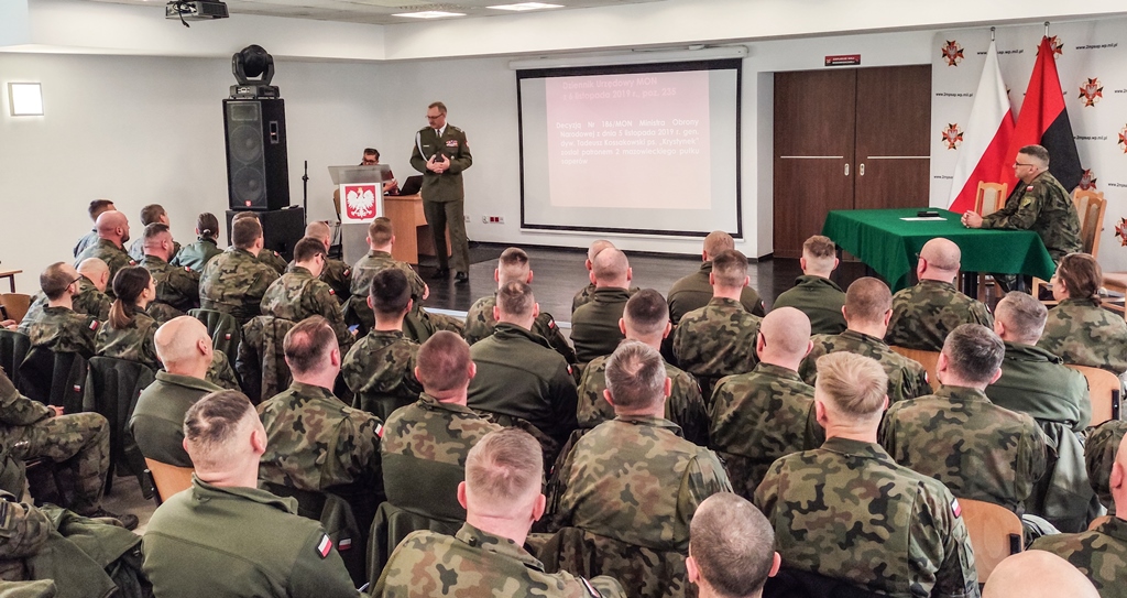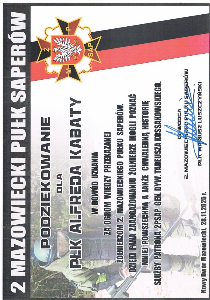 Po zakończeniu prelekcji płk Mariusz Łuszczyński podziękował za ciekawy wykład i przekazał na ręce płk. Alfreda Kabaty okolicznościowy dyplom, w którym napisał: „W dowód uznania za ogrom wiedzy przekazanej żołnierzom 2. Mazowieckiego pułku saperów. Dzięki Pana zaangażowaniu żołnierze mogli poznać mniej powszechną, a jakże chwalebną historię służby patrona 2psap gen. dyw. Tadeusza Kossakowskiego”.