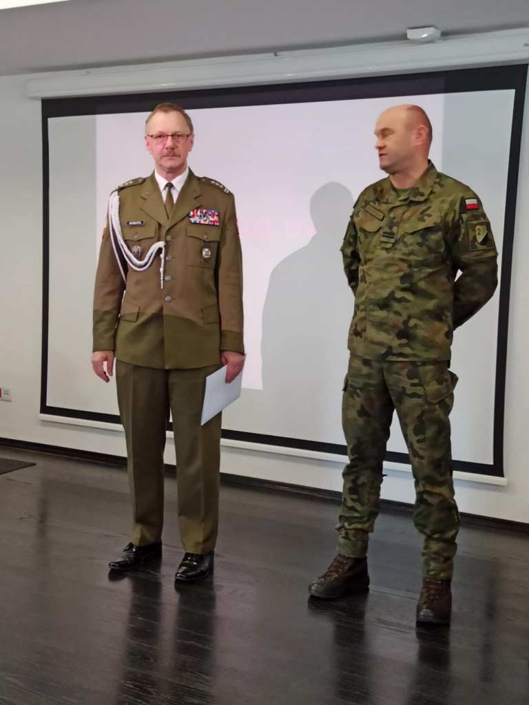 Przed rozpoczęciem prelekcji płk Mariusz Łuszczyński – dowódca pułku, powitał płk rez. Alfreda Kabatę i towarzyszącego mu ppor. rez. Stanisława Wojciecha Wykowskiego.