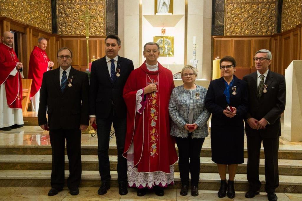 Przed błogosławieństwem Za zasługi w upamiętnieniu ofiar Zbrodni Katyńskiej oraz upowszechnianie wiedzy o martyrologii Polaków na Wschodzie bp Józef Guzdek uhonorował pięć osób: Teresę Bracką, Marka Krystyniaka, Jarosława Olbrychowskiego, Stanisława Sikorskiego i Annę Wesołowską medalami „W służbie Bogu i Ojczyźnie”, ustanowionymi z okazji setnej rocznicy powstania Biskupstwa Polowego w Polsce.