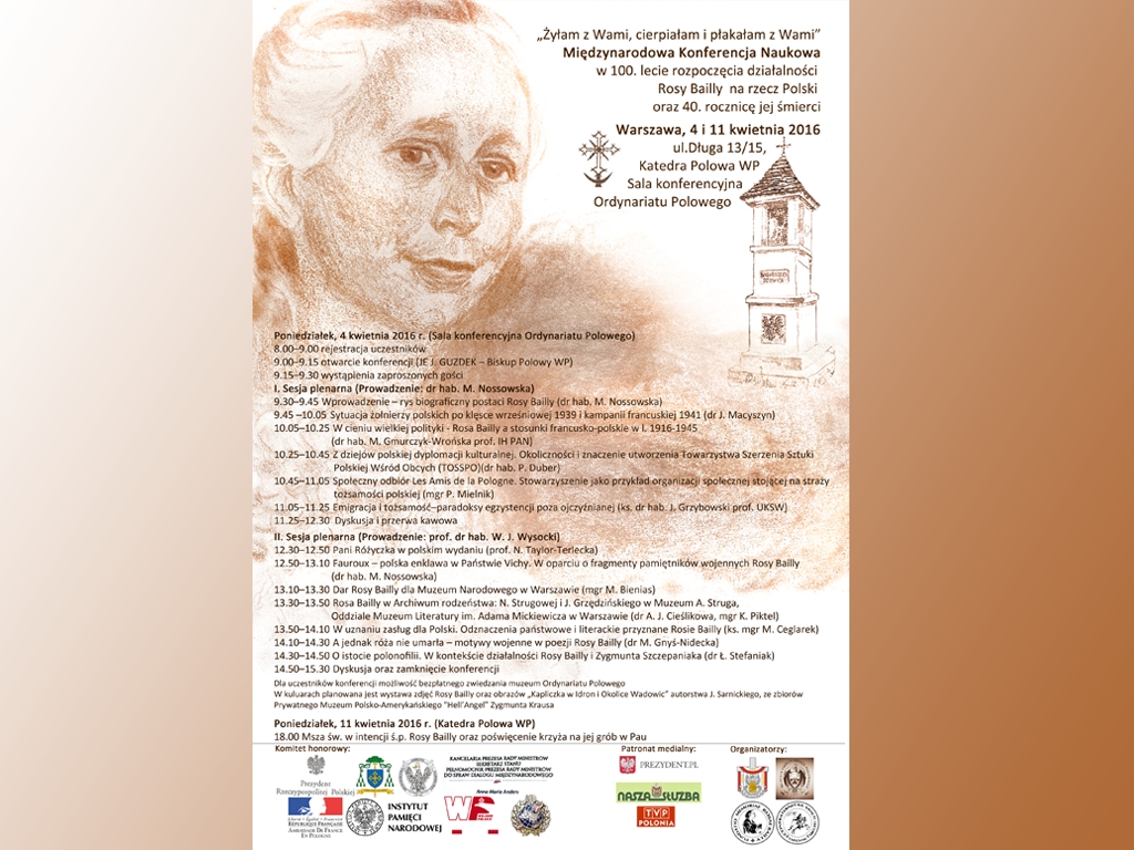 Konferencja, której organizatorami byli Ordynariat Polowy, Muzeum Ordynariatu Polowego – oddział Muzeum Historycznego Miasta Stołecznego Warszawy, Konfraternia św. Jakuba Apostoła Starszego przy katedrze polowej oraz Fundacja Pamięci Rosy Bailly w Warszawie, upamiętniła 40. rocznicę śmierci Rosy Bailly oraz 100-lecie rozpoczęcia jej działalności na rzecz Polski.