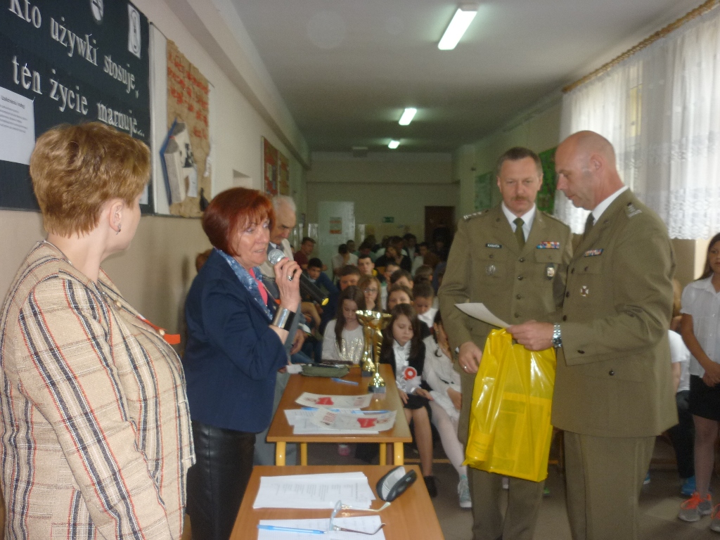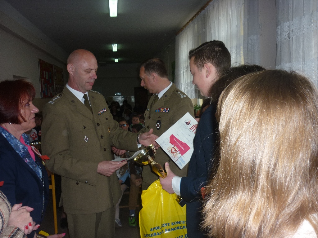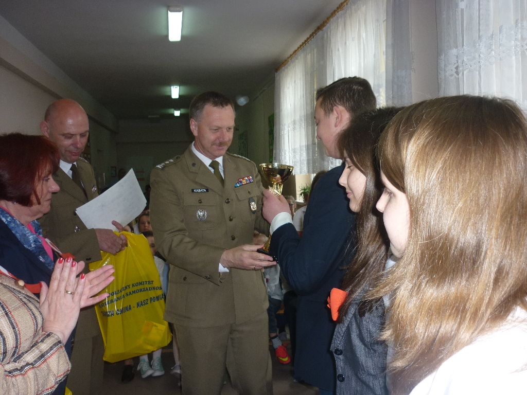 Laureaci otrzymali dyplomy, nagrody rzeczowe i puchary. Fundatorami nagród rzeczowych byli wójt Gminy Leoncin, Związek Oficerów Rezerwy Rzeczypospolitej, Społeczny Komitet Wspierania Samorządności „Nasza Gmina – Nasz Powiat”. Puchary ufundował Związek Oficerów Rezerwy Rzeczypospolitej. Nagrody i puchary wręczali: płk rez. Alfred Kabata – prezes ZG ZOR RP wraz z płk. rez. Dariuszem Zielonką i Romanem Kaczorowskim oraz Jolanta Liszkiewicz – wiceprzewodnicząca SKWS „Nasza Gmina – Nasz Powiat”. Gratulacje uczniom złożyła także Irmina Tokarska - Iwaniuk – dyrektor szkoły.