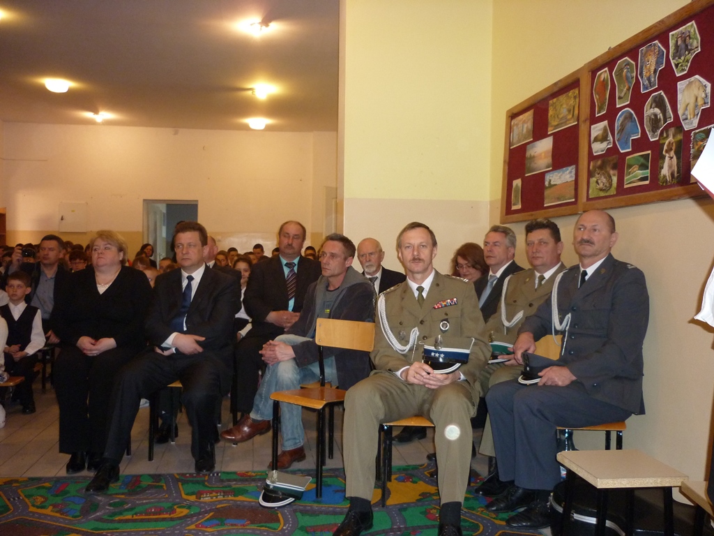 Uroczystości 73 rocznicy zbrodni Katyńskiej rozpoczęły się od powitania przez dyrektor szkoły zaproszonych gości, wśród których byli m. in. Bogdan Glinka – burmistrz Myszyńca, Bohdan Sobiewski – syn kpt. Franciszka Sobiewskiego i jego kuzyn Krzysztof Sobieski.