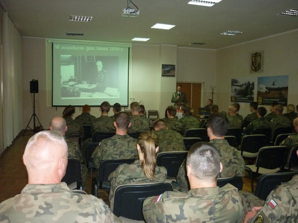 Przed rozpoczęciem uroczystości na tarnogórskim rynku, płk rez. Alfred Kabata przeprowadził wykład z wykorzystaniem prezentacji multimedialnej dla uczniów klas mundurowych Zespołu Szkół Techniczno – Usługowych w Tarnowskich Górach i kadry jednostki na temat życia i działalności wojskowej patrona pułku gen. broni Leona Berbeckiego.