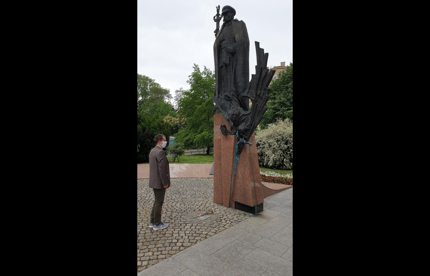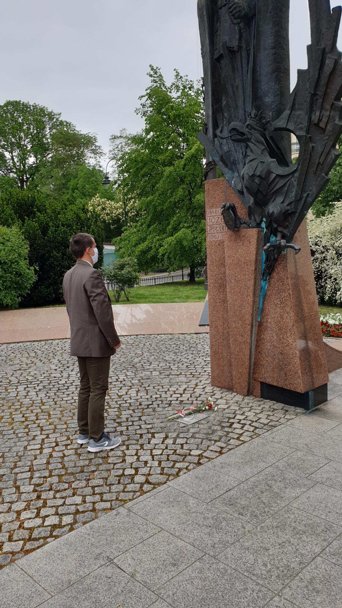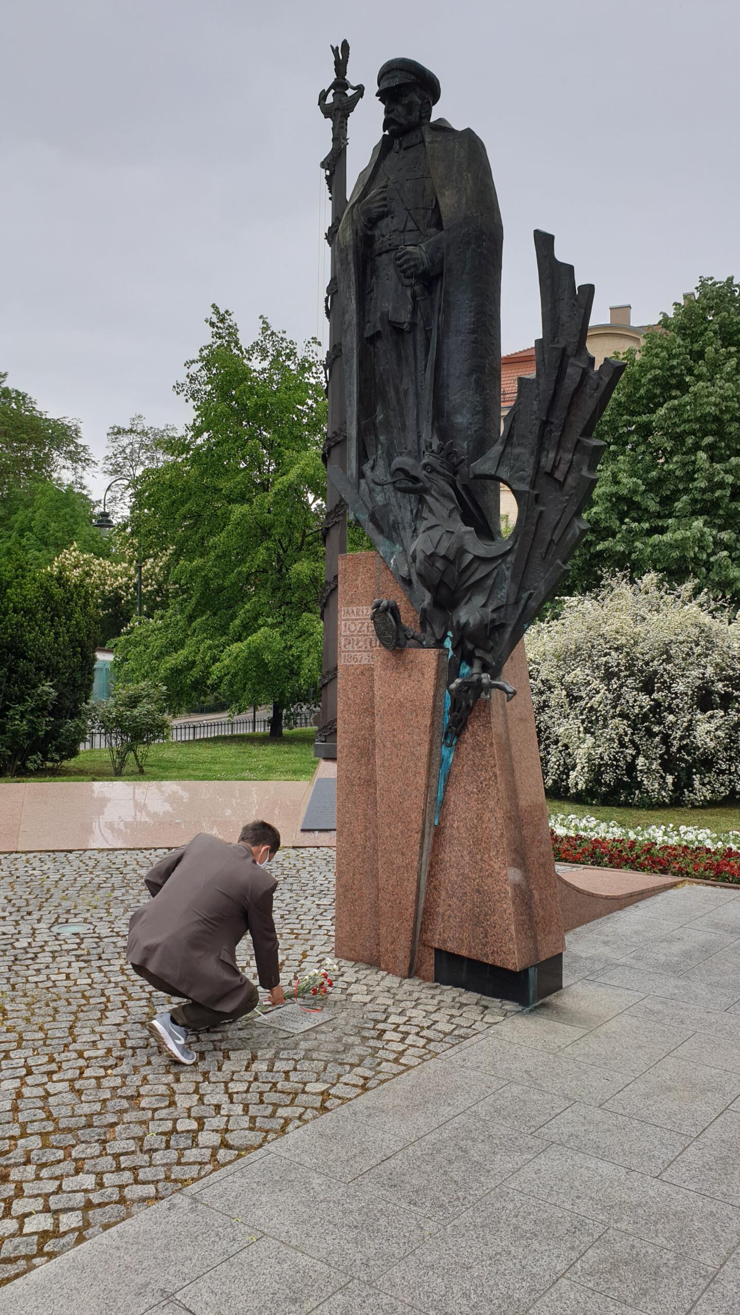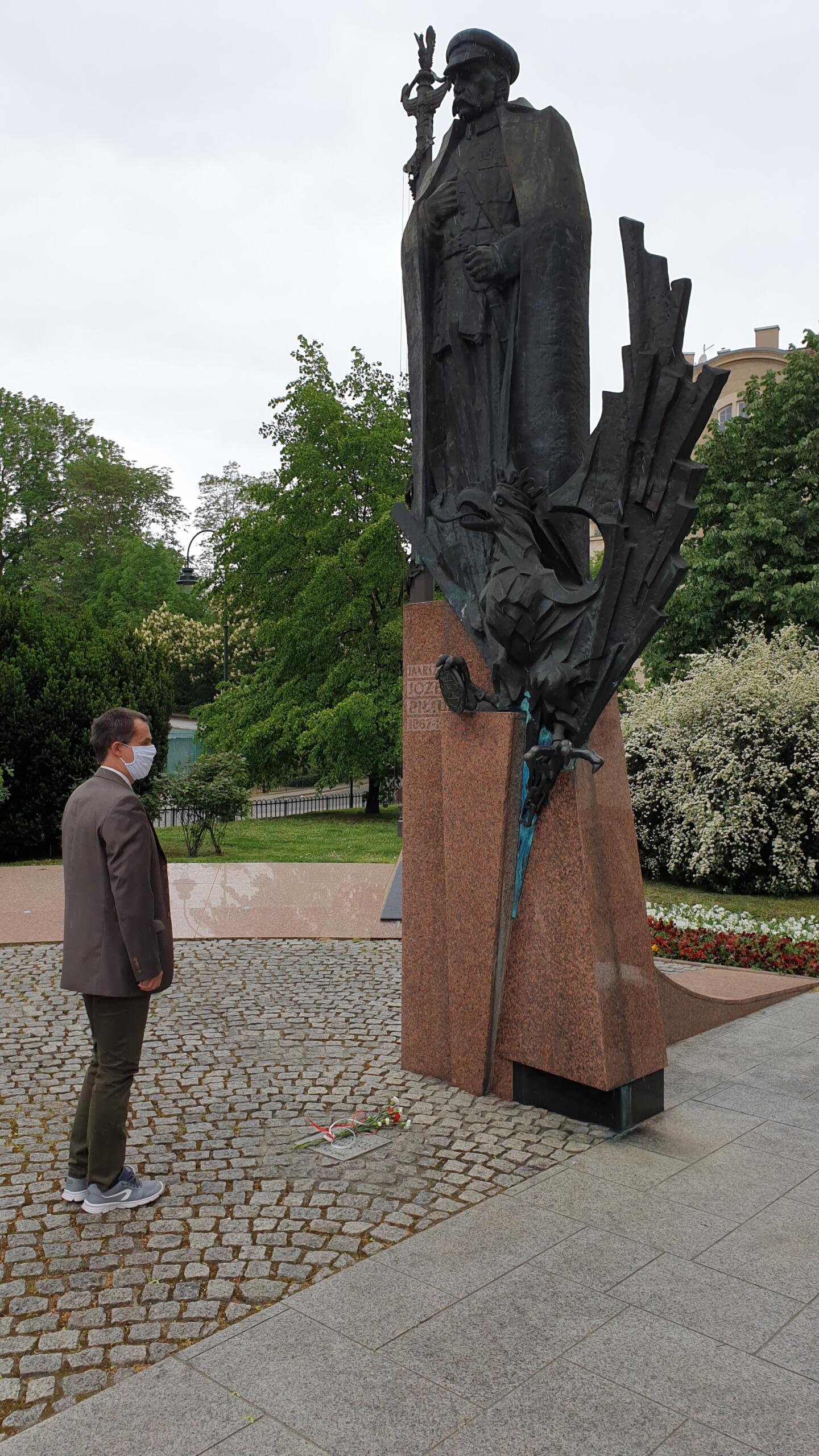 Kwiaty złożone zostały pod pomnikiem Józefa Piłsudskiego na skwerze u zbiegu ulic Piłsudskiego, Wenecja i Garncarskiej. Pomnik składa się z dwóch części. Pierwsza