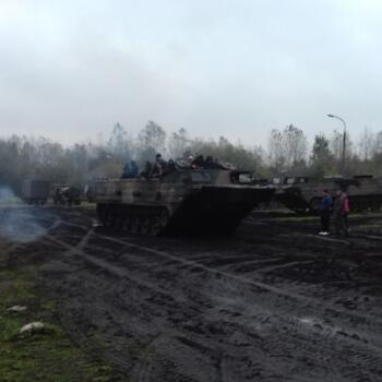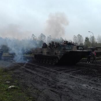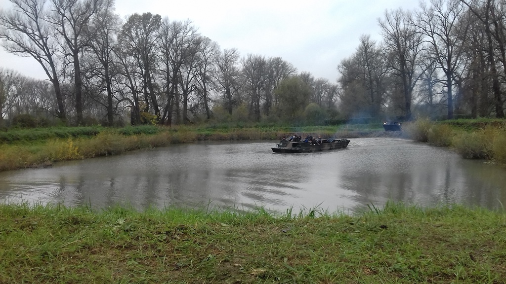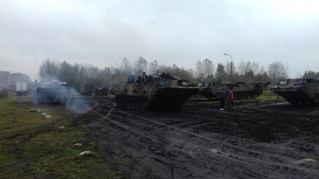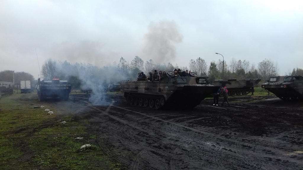 Dużą atrakcją dla uczniów była możliwość wejścia na skrzynię ładunkową i jazdy amfibią – czyli pływającym transporter gąsienicowym PTS- M, zarówno w terenie jak i podczas przeprawy przez znajdujący się w koszarach akwen wodny. Uczniowie dowiedzieli się, że pływający transporter samobieżny waży prawie 18 ton, a jego silnik ma 350 koni mechanicznych. Na skrzynię ładunkową może zabrać około 10 ton ładunku lub 70 osób. Jest wykorzystywany głównie podczas powodzi. Takimi pojazdami przewozi się ludzi oraz sprzęt z zalanych terenów. PTS radzi sobie z falami sięgającymi 4 stopni w skali Beauforta.