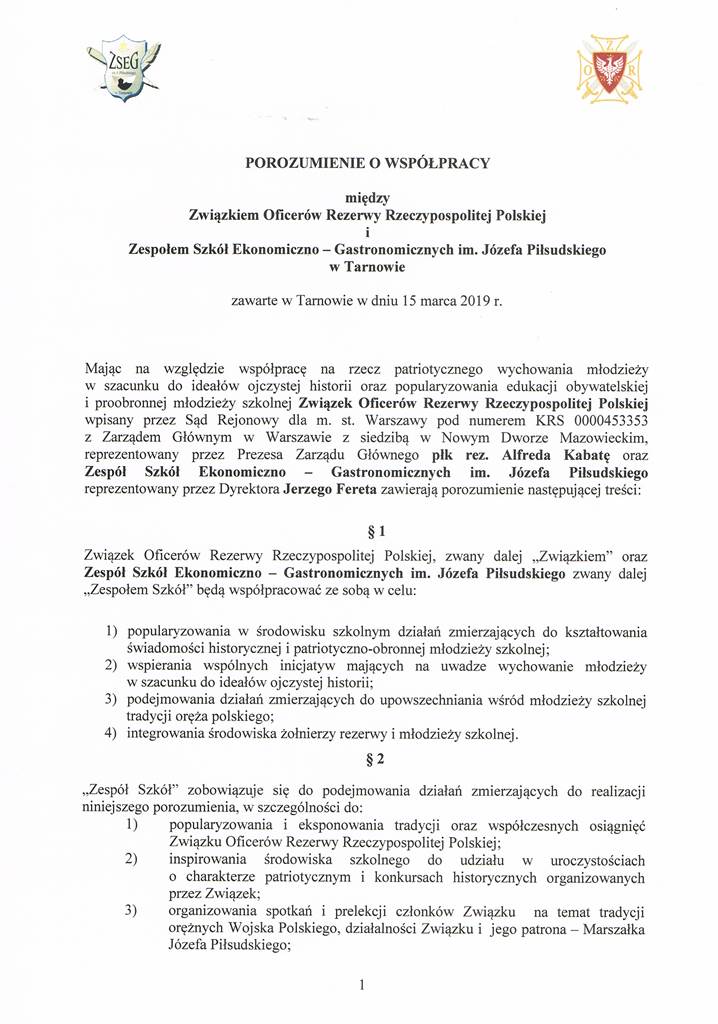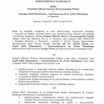 15 marca 2019 r., w Tarnowie, podpisano porozumienie o współpracy pomiędzy Związkiem Oficerów Rezerwy Rzeczypospolitej Polskiej a Zespołem Szkół Ekonomiczno – Gastronomicznych im. Józefa Piłsudskiego.