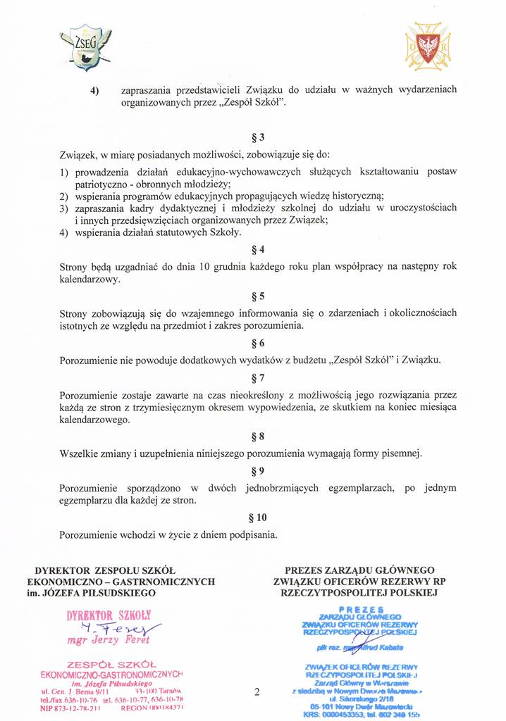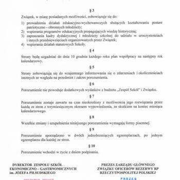 W podpisanym porozumieniu Związek Oficerów Rezerwy Rzeczypospolitej Polskiej oraz Zespół Szkół Ekonomiczno – Gastronomicznych im. Józefa Piłsudskiego zobowiązali się, że będą współpracować ze sobą w celu:
